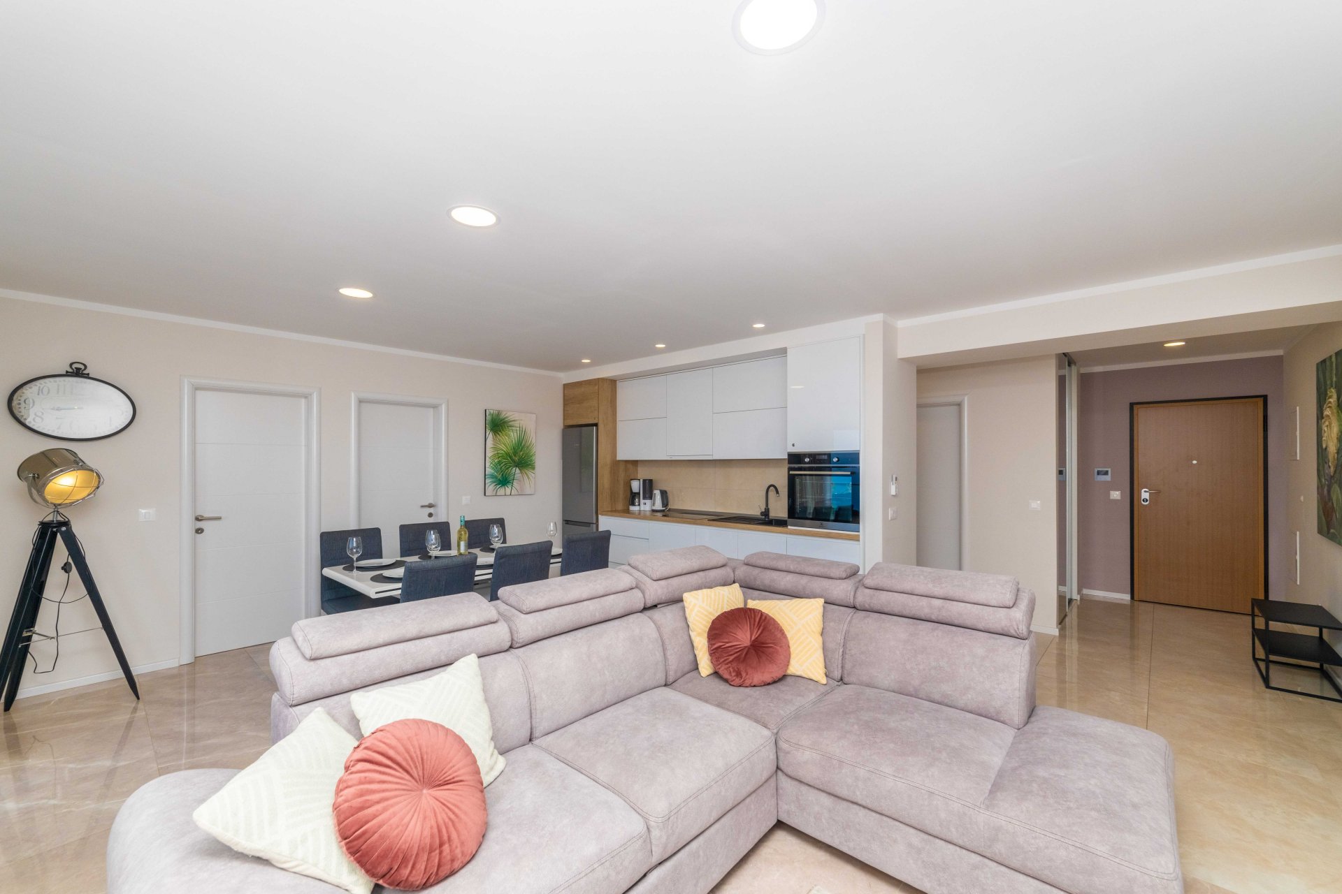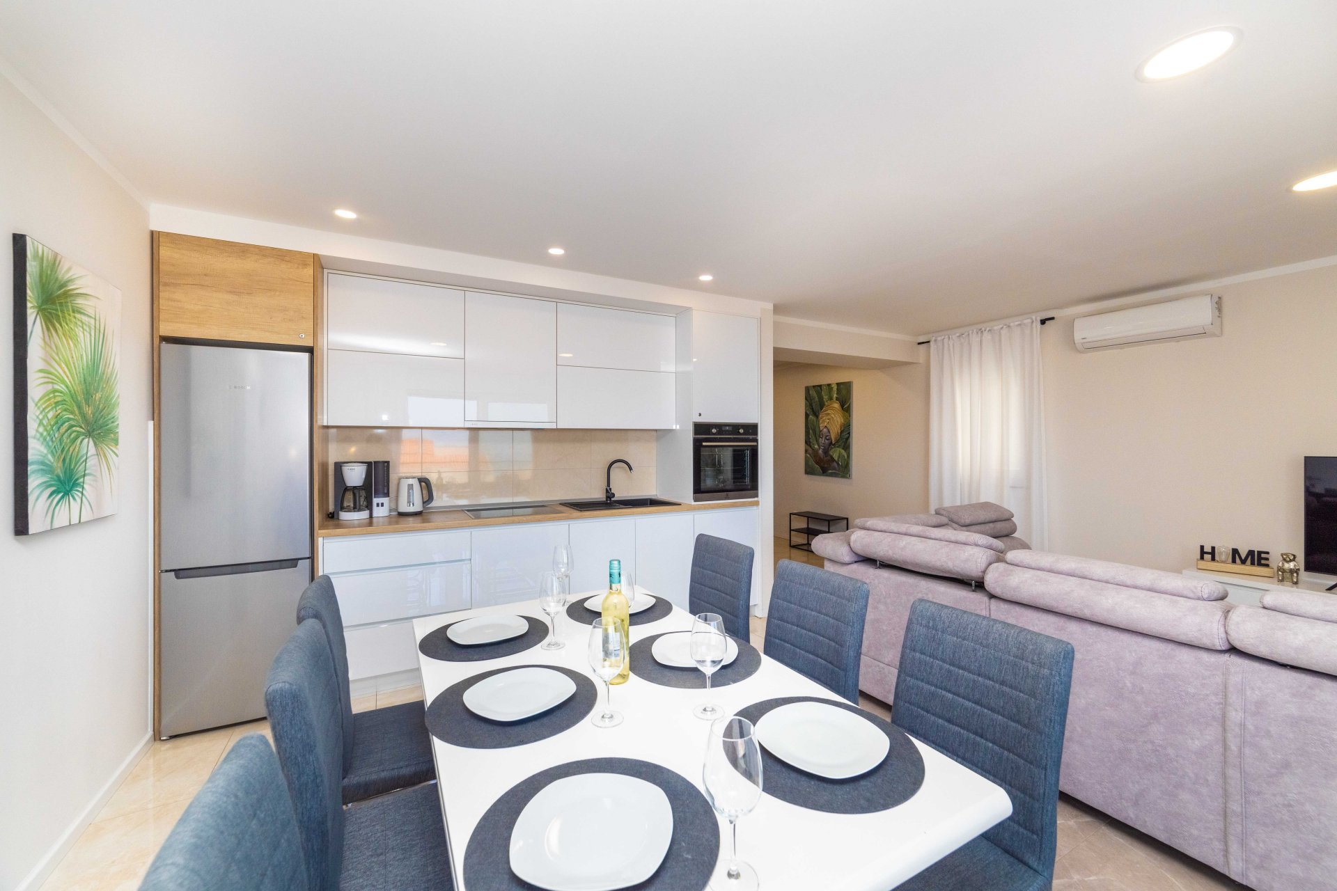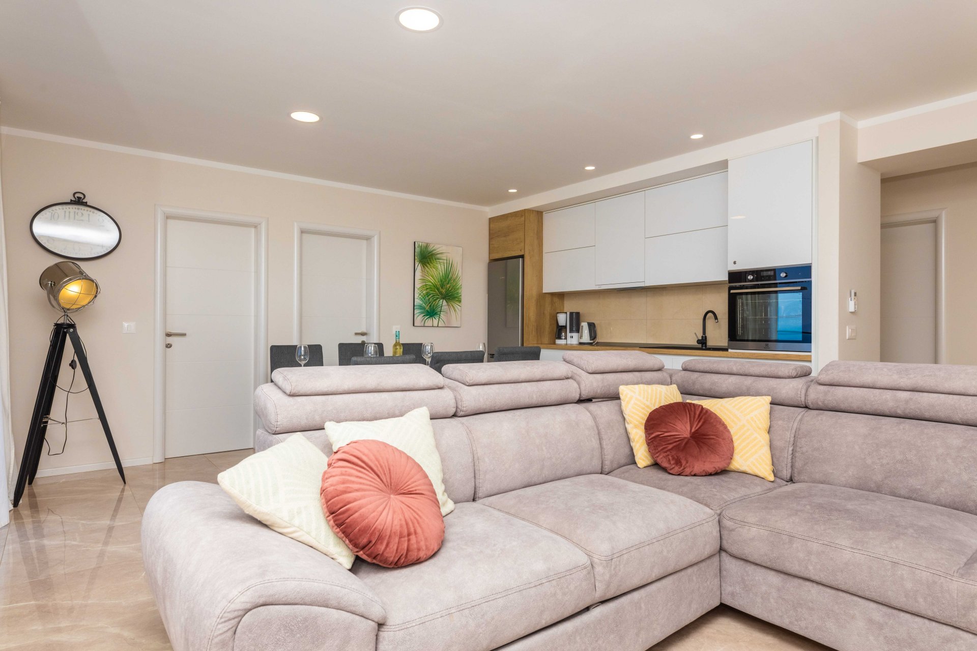 This luxury three-bedroom apartment offers spacious accommodations with modern amenities, including a fully equipped kitchen, free WiFi, air-conditioning, two balconies, a sea-view terrace, and private parking, ensuring a relaxing and enjoyable vacation.