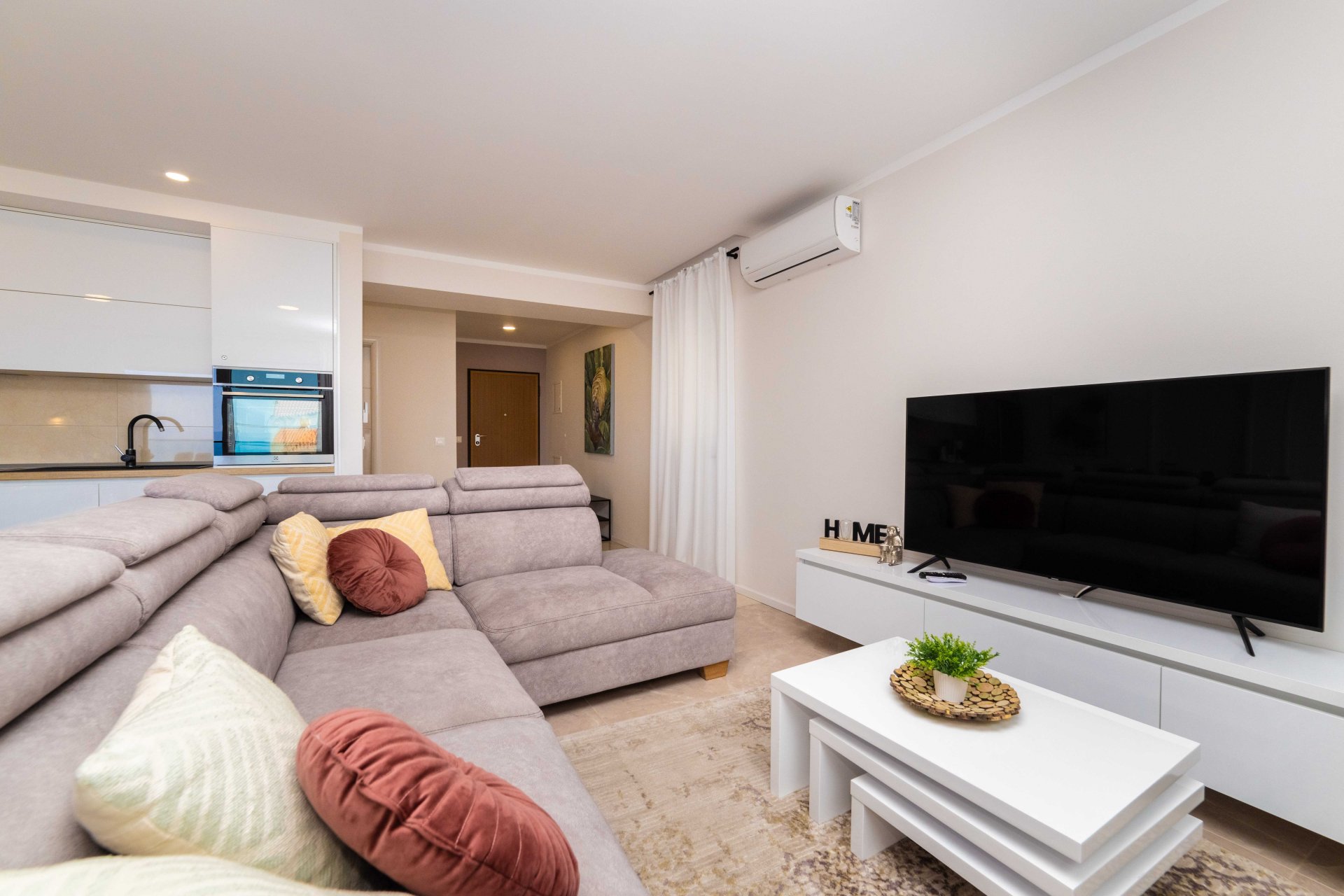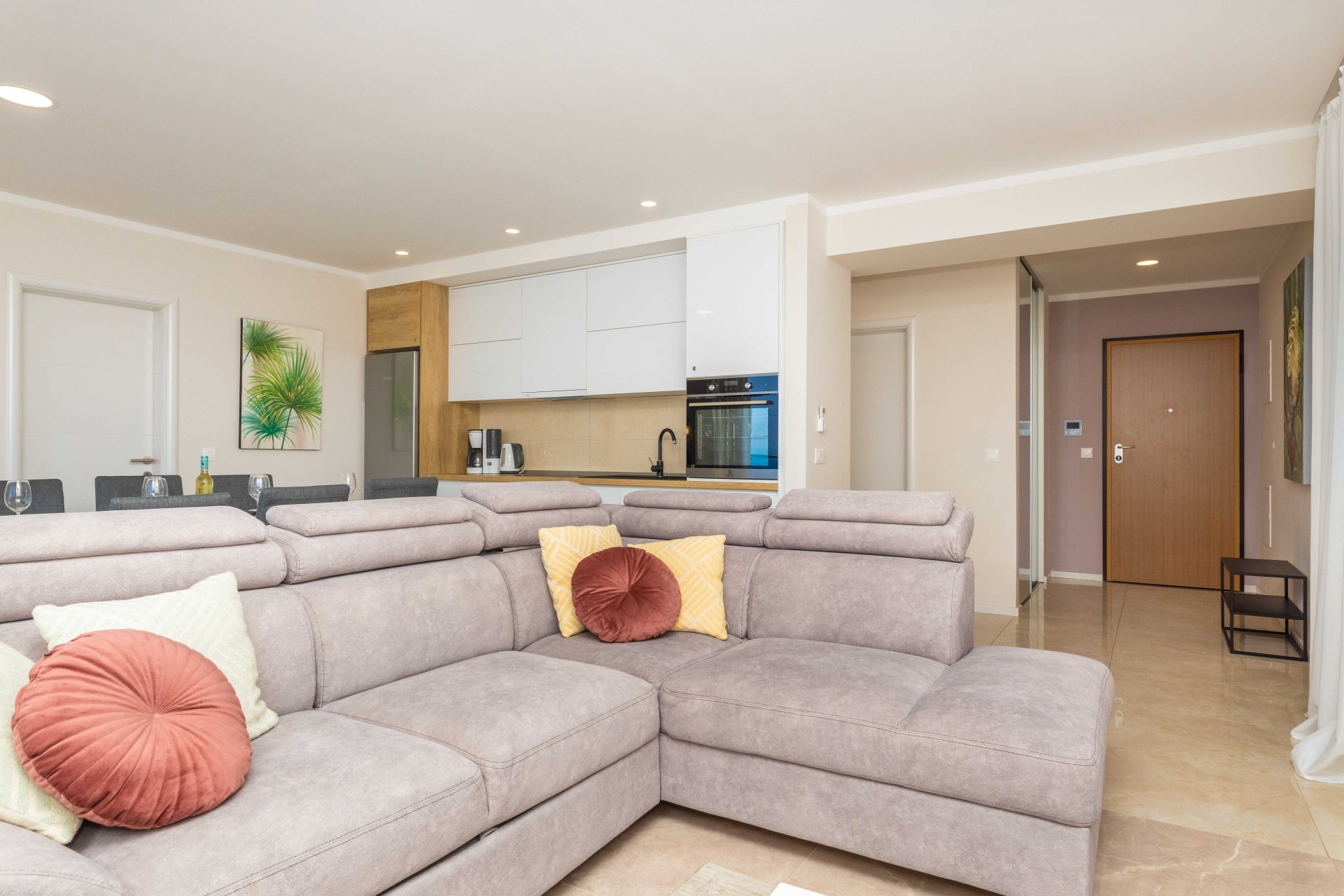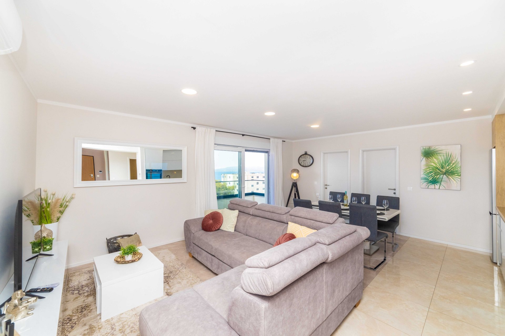 This luxury three-bedroom apartment offers spacious accommodations with modern amenities, including a fully equipped kitchen, free WiFi, air-conditioning, two balconies, a sea-view terrace, and private parking, ensuring a relaxing and enjoyable vacation.