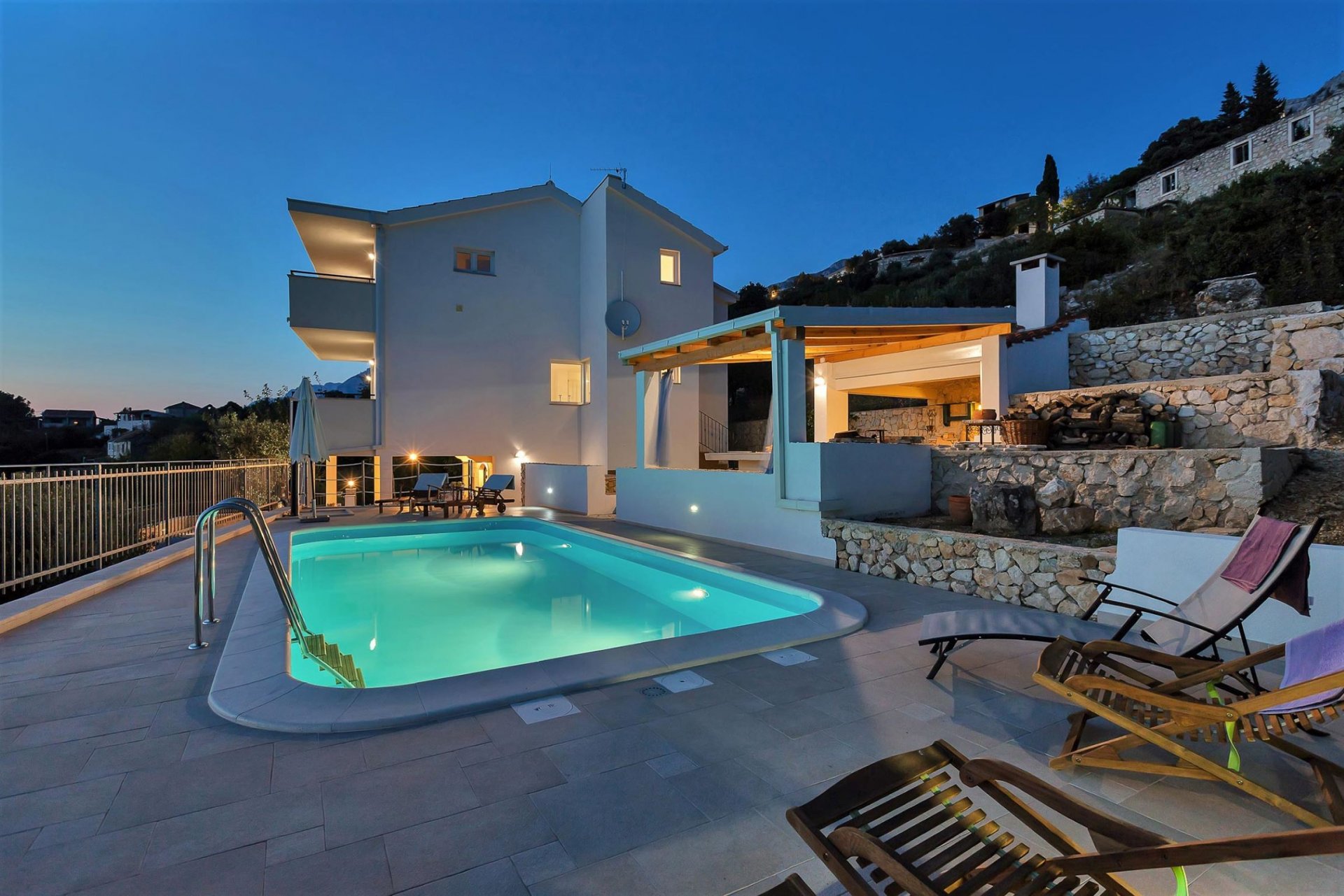 Balcony, Terrace, Roofed terrace, Air-conditioning, BBQ grill, Pool - private, Fireplace - wood, Private garden, Patio, Sun loungers or beach chairs, Sun umbrellas, Living Room, Outdoor dining areaBathroom