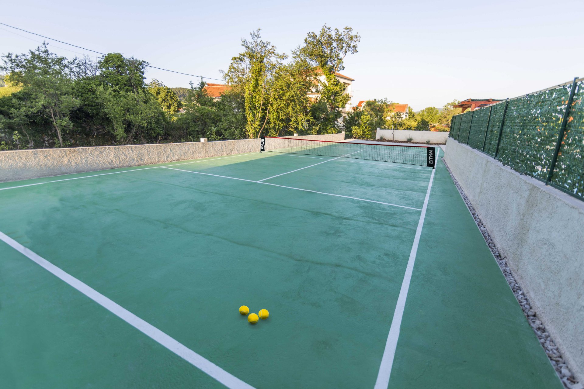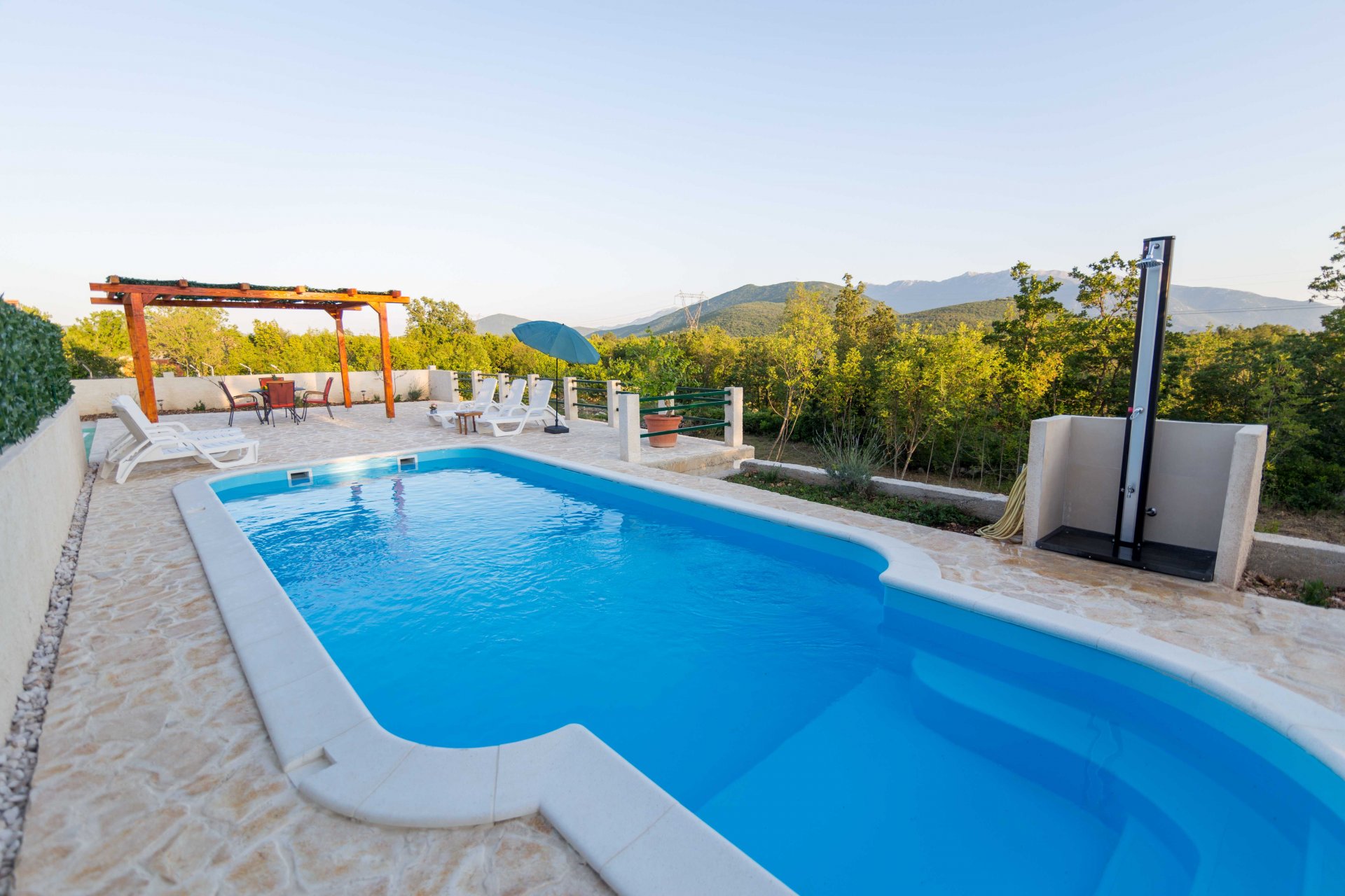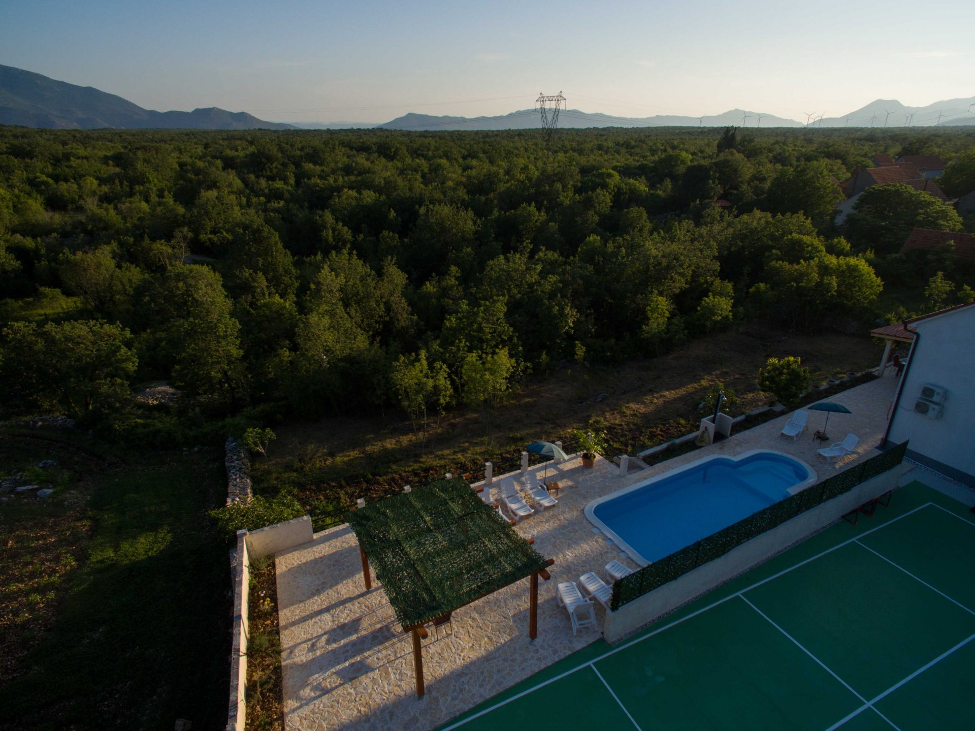 Villa Paloma Blanca, located in Lovreć, is the best choice if you want to spend your vacations in peace and quiet environment, far from the city crowds, and also to have nearby all you need during your holidays. Outdoor swimming pool, BBQ facility, tennis and basketball court and football pitch make this property perfect for a holiday with friends or family. Children's playground with a swing set and a slide is at guests' disposal as are ironing facilities. Free parking is available on site. Washing machine, ironing board and hairdryer are also on guests disposal. Baby cot and high chair are available upon request. Property is just 1 hour driving from the Split and famous promenade Riva Split where you can enjoy beautiful sea view, magnificent sunsets and experience true Dalmatian culture and history. Makarska is just 40 minutes driving from the property. Split Bus Station and Ferry Port, connecting the mainland with various Dalmatian islands, are 58 minutes ride from the apartment, while Split Airport is 73.1 km away. This four-bedroom villa features free WiFi, air-conditioning, and SAT LCD TV, a fully equipped kitchen with a dining area, a living room, so as three private bathrooms, and a separate toilet. The kitchen is equipped with an oven, stove, water kettle, toaster, microwave, refrigerator, coffee maker, and dishwasher. It will also provide you with a lovely furnished terrace and balcony with a garden and pool view. Outdoor swimming pool, BBQ facility, tennis and basketball court, and football pitch make this property perfect for a holiday with friends or family. Children's playground with a swing set and a slide is at guests' disposal as are ironing facilities. Free parking is available on site. The washing machine, ironing board, and hairdryer are also at guests' disposal. Pets are allowed upon request and an additional charge of 5 euros. Baby cot and high chair are available upon request.